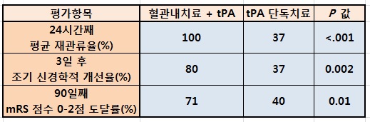24시간째 혈관내 치료군의 재관류율은 100%(중앙값)로 tPA 단독요법군(37%)보다 높았고(P<0.001), 3일째 조기신경학적 개선에 도달한 환자 비율도 혈관내 치료군(80%)에서 tPA 단독요법군(37%) 대비 2배 가량 많았다(P=0.002).