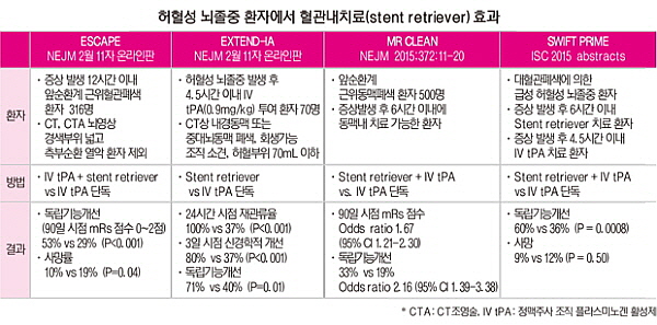 지난 2월 국제뇌졸중컨퍼런스(ISC 2015)의 최대 관심사는 단연 허혈성 뇌졸중 환자의 혈관내 치료(endovascular therapy)에 관한 임상연구였다. 정맥내 혈전용해술에 더해지는 동맥내 혈전제거술이 기존 연구에서 지지부진한 성적을 면치 못했던 것에 반해 이번에 발표된 4개 연구 모두 긍정적인 결과를 도출하면서 상황을 역전시켰다.
