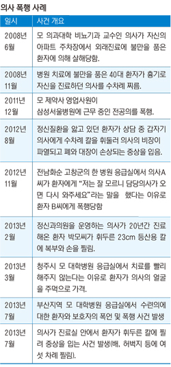 # 2008년 11월과 2012년 8월, 2013년 2월과 7월에도 각각 진료 중인 의사가 환자가 휘두른 칼에 찔려 중상을 입는 사건이 발생했다. 응급실에서 근무 중이던 의사나 전공의들이 환자에게 폭행당한 사례도 2008년 이후 언론에 알려진 것만 4건에 이른다. 해당 의사들은 빨리 치료를 해주지 않는다는 이유 등으로 환자들에게 폭행을 당한 것으로 알려졌다.