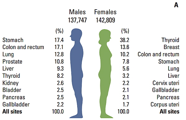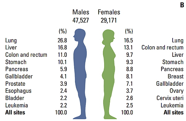 암종별로는 남성 10만명당 50.1명이 폐암, 31.5명이 간암, 20.5명이 대장암, 18.9명이 위암, 11.1명이 췌장암으로 숨질 것으로 예상됐으며, 여성은 10만명당 19명이 폐암, 15명이 대장암, 11.1명이 간암, 10.7명이 위암, 10.1명이 췌장암으로 사망할 것으로 추정됐다.