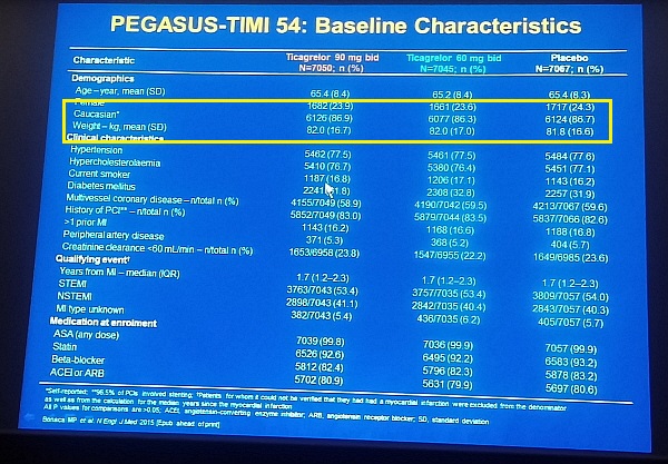 발표에서 제시된 피험자들의 베이스라인 특징을 살펴보면 티카그렐러 90mg과 60mg 투여군, 위약군 모두에서 코카시안이 약 86%의 비율을 보이고, 체중 역시 평균 82kg 수준을 유지한다.