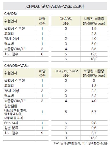 - 뇌졸중 위험도 평가도구로 CHA2DS2-VASc 스코어를 권고한다(B).