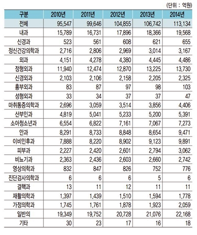 내과의 경우 청구건이 2516만3646에 달하지만, 전문의 수가 내과에 비해 절반정도 적은 외과는 청구건이 326만830건에 그친다. 오히려 외과보다 전문의 수가 적은 정형외과(1229만1149건)나 이비인후과(1652만5651건)에서 청구되는 건이 더 많은 실정이다.