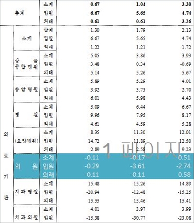 반면 산부인과, 외과, 비뇨기과의 증가 폭은 매우 저조했고, 이들 기관의 환자 내원일수는 모두 감소했다. 실제 의원급 의료기관의 올해 1분기 요양일수는 전년 대비 0.51% 올랐으나, 청구 건수는 0.11%, 내원인수는 0.17% 감소했다.