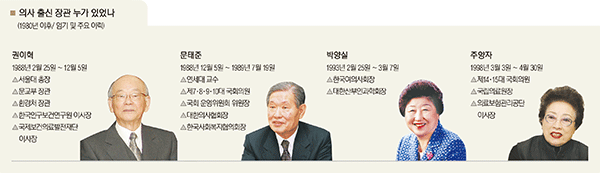건국 이후 1960년대까지 초기 행정부에서는 대대로 의사가 보건부 장관을 맡아왔으나, 이후 정치인·관료 장관이 등장하면서 그 명맥이 끊겼다. 1988년 권이혁 전 장관의 취임으로 의사 장관이 다시 부활했지만 같은 해 문태준 전 장관, 1993년 박양실 전 장관을 거쳐 1998년 주양자 전 장관을 끝으로 또 한 번 막을 내렸다.