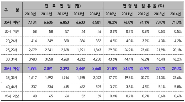 건강보험심사평가원은 이달 10일 임산부의 날을 맞이해 최근 5년간 심사결정자료를 분석한 결과 지난해 35세 이상 진료인원이 전체에서 차지한 비율이 2010년 대비 21.8%에서 29%로 33.4% 늘었다고 밝혔다.