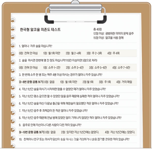 특히 서 전임의가 여성 환자 400여 명을 대상으로 연구한 결과 한국형 AUDIT 질문 가운데 △5번 문항 '지난 1년간 평소 같으면 할 수 있었던 일을 음주 때문에 실패한 적이 얼마나 자주 있었습니까?' △7번 문항 '지난 1년간 음주 후에 죄책감이 든 적은 얼마나 자주 있었습니까?'가 알코올 사용 장애 환자를 선별하는 데 가장 효과적인 항목들이었다<표>.