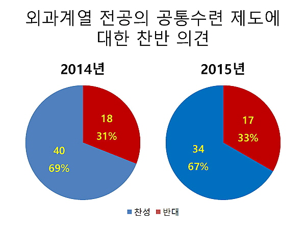 통합수련제도에 찬성하는 이유로는 '외과 전반에 대한 기본 지식 및 술기 통합교육'이라고 응답한 비율(2014년 60%, 2015년 70%)이 가장 많았고, '다양한 분야에 대한 경험 후 세부 전공 선택'(2014년 25%, 2015년 68%), '공통수련 후 진로의 다양성 확보'(2014년 20%, 2015년 44%) 등이 뒤를 이었다.