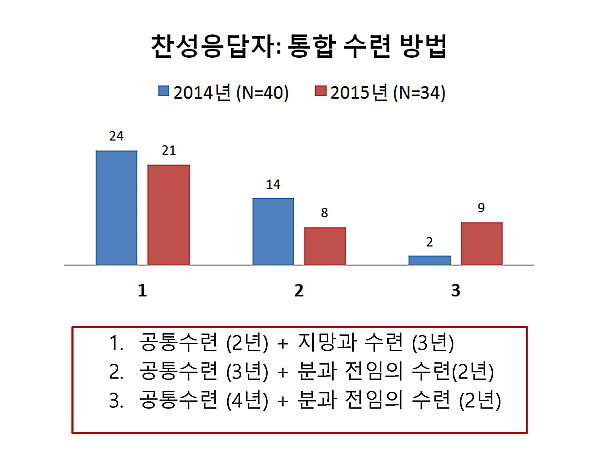 구체적인 통합수련 방법으로는 '공통수련(2년)+지망과 수련(3년)'의 지지율이 가장 많았으며(2014년 60%, 2015년 62%), '공통수련(3년)+분과 전임의 수련(2년)'과 '공통수련(4년)+분과 전임의 수련(2년)'은 2015년 기준 각각 24%(34명 중 8명)와 26%(34명 중 9명)로 비슷한 분포를 보였다.