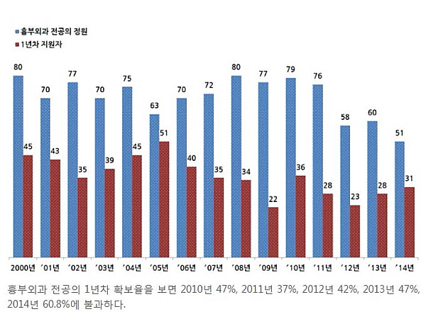 2006년부터 기피과에 월 50만원의 전공의 수련보조 수당이 지급되고, 2009년 흉부외과 100%라는 수가 가산금이 도입됐지만 흉부외과의 전공의 1년차 확보율은 2010년 47%, 2011년 37%까지 급감했고, 2012년 42%, 2013년 47%로 비슷한 수준이었다. 2014년 60.8%로 소폭 올랐지만 여전히 다른 과와 비교하면 턱없이 부족하다.