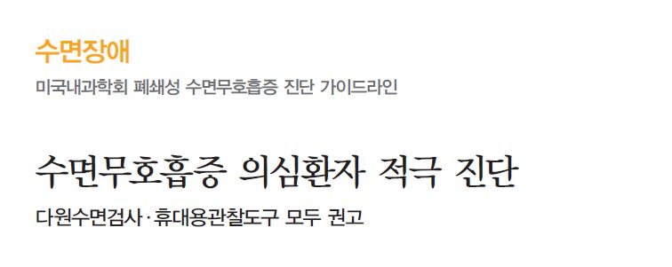 ACP가 가이드라인을 통해서 강조한 주요 내용은 OSA 의심환자에 대한 관리의 필요성과 다원수면검사와 휴대용 관찰기기 등을 통한 적극적인 평가다. 단 두 가지 권고사항 모두 권고강도나 근거수준은 높지 않았고, 첫 번째 권고사항이 수면 연구를 언급하고 있다는 점은 OSA 관련 근거들이 많지 않았다는 점을 반영해주고 있다.
