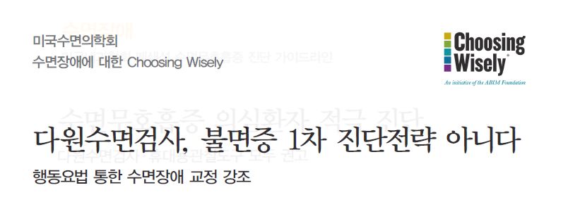 미국내과학회(ACP)가 폐쇄성 수면무호흡증(OSA) 진단 가이드라인을 통해 적극적인 관리를 강조한 것과 별도로 미국수면의학회(AASM)는 만성 불면증에서 조심스러운 다원수면검사 시행을 강조했다. AASM은 지난해 12월 미국내과학회이사회(ABIM) ‘Choosing Wisely’ 캠페인의 일환으로 임상현장에서 수면장애 관리를 위해 의사와 환자가 명심해야 할 5가지를 정리했다.