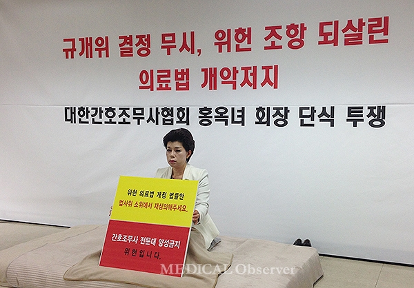 대한간호조무사협회 홍옥녀 회장은 3일 협회 사무실에서 기자회견을 열고 "목숨 걸고 전문대 양성을 사수할 것"이라며 법안 저지에 총력을 기울이겠다는 각오를 비췄다.