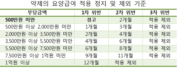 국민건강보험법 제41조2, 제99조 제2항~제7항은 리베이트와 관련된 약제의 경우 1년의 범위에서 요양급여의 적용을 정지하고, 급여 적용이 정지됐던 약제가 또 다시 정지 대상이 되면 총 정지 기간 및 위반정도 등을 고려해 요양급여에서 제외하는 내용 등을 담고있다.