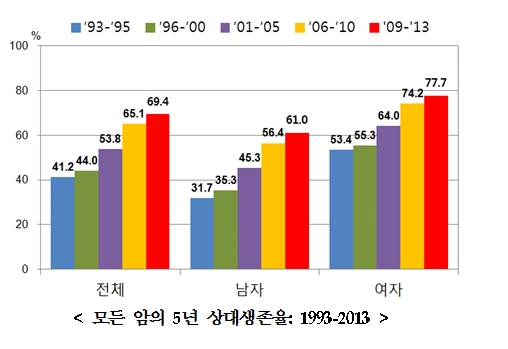 지난 2009년부터 2013년까지 최근 5년간 발생한 암환자의 5년 상대생존율(이하 생존율)은 69.4%로, 3명 중 2명 이상은 5년 이상 생존할 것으로 추정됐다. 또 2001년부터 2005년 생존율 53.8% 보다 15.6%p 향상된 것으로 조사됐다.