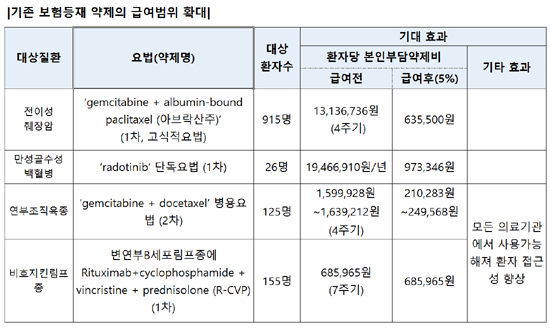 복지부 관계자는 "이번 건강보험 급여 확대는 췌장암과 같이 치료제가 부족하거나, 만성골수성백혈병이나 연부조직육종 등 환자수가 적어 지원 순위에서 밀릴 우려가 있는 암질환에 대해 건강보험 보장성을 확대하는 조치인만큼 의의가 더 크다"고 설명했다.