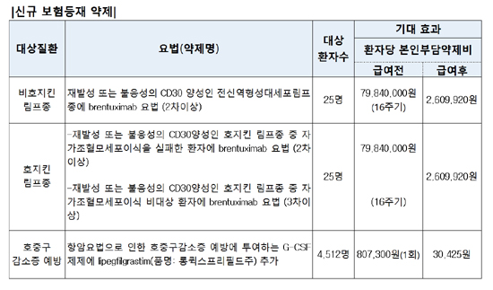 비호지킨림프종 중 전신역형성대세포림프종 및 호지킨림프종 중 자가조혈모세포이식 대상이 아니거나 실패한 환자에 건강보험을 적용토록 했다.