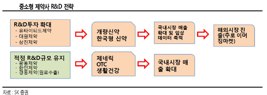 SK증권 하태기 연구원은 "중소형 제약사는 일정 부문 사업영역에서 특화전략을 갖고 있지만 정부규제가 지속되고 업체 간 경쟁이 심화되는 영업환경에서 새로운 성장동력 마련이 필요한 상황"이라며 "사업영역 확대를 통한 성장성 제고 노력이 이어질 것"이라고 말했다.