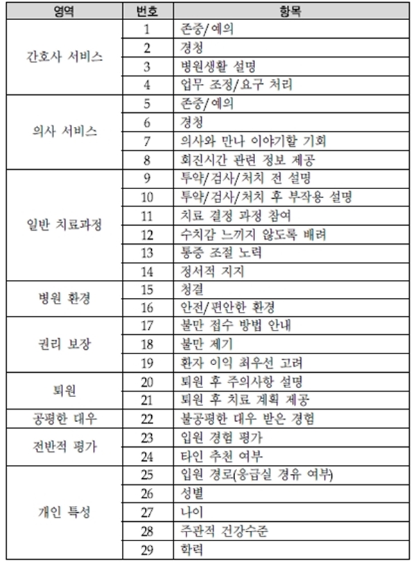 29개 항목을 살펴보면 간호사 서비스 영역에서는 ▲존중/예의 ▲경청 ▲병원생활 설명 ▲업무 조정/요구 처리 등이며, 의사 서비스 영역에서는 ▲존중/예의 ▲경청 ▲의사와 만나 이야기할 기회 ▲회진시간 관련 정보 제공 등이다.