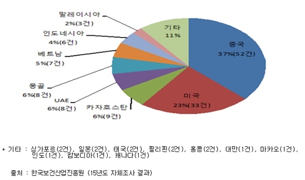 우리나라 의료기관 해외진출 건수가 지난 2010년 58건에서 2015년 기준으로 141건으로 5년동안 1.5배 증가한 것으로 나타났다. 국내 의료기관이 많이 진출하고 있는 국가는 중국, 미국 등이었으며, 진출하는 의료기관이 점차 전문화·대형화 추세인 것으로 나타났다.