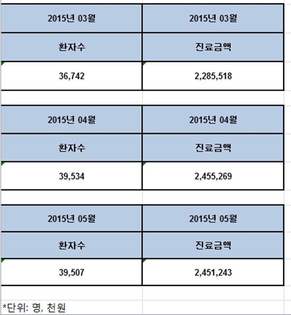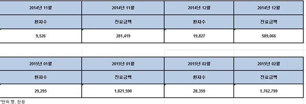 이에 따른 진료비 역시 2014년 11월 2억 8141만원, 12월 5억 8906만원에 불과했지만, 2015년 1월은 18억 2159만원, 2월 17억 6279만원으로 급격히 늘었다.