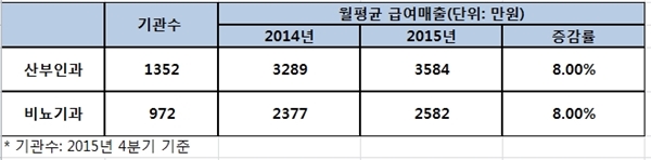 산부인과는 2015년 월평균 급여매출은 3584만원으로 2014년(3289만원)과 비교할 때 295만원 늘었다. 이는 전년 대비 8.0% 상승한 수치다.