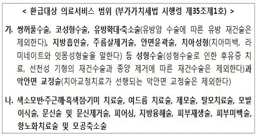 현행 부가가치세법은 ▲쌍꺼풀 수술과 코성형 수술 등 성형수술 ▲색소모반·주근깨·기미치료술 등 피부과 시술을 부가세 적용대상으로 규정하고 있다. 성형수술의 후유증의 치료나 재건수술 등 치료목적의 의료행위는 부가세 적용, 환급 대상에 포함되지 않는다.