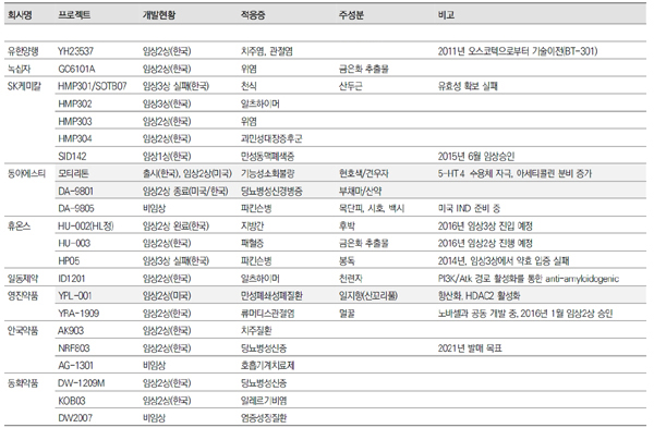 유한양행은 치주염관절염치료제로 'YH23537' 2상을 진행하고 있으며 SK케미칼은 천식과 알츠하이머, 위염 등을 타깃으로 5개 천연물의약품을 개발 중이다. 휴온스, 일동제약, 안국약품, 동화약품 등도 천연물신약 파이프라인을 보유하고 있다.