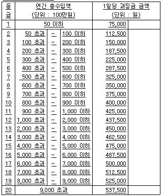 의료기관의 1일 평균 수입액에 일정 과징율을 적용하는 방식으로, 수입액이 많은 사업자의 경우 과징금 수준이 높아지고, 반대로 매출이 적은 사업자는 그 금액이 작아진다.