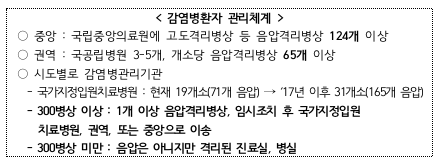 이에 더불어 정부는 권역별 전문병원으로 국공립의료기관 중 3~5곳을 추가 지정해 운영키로 했다. 권역 감염병 전문병원에는 음압격리병상 65개 이상과 전담 전문의 5인 이상을 갖춰, 감염병 환자 에 대응토록 할 예정이다.