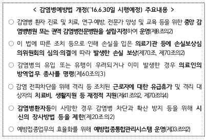 국가 중앙 감염병 전문병원으로 국립중앙의료원이 지정됐다. 감염병 진료로 손실을 본 의료기관에 대한 피해보상 규정, 감염병 진료에 동원된 의료인에 대한 지원방안도 법률로 명시된다.