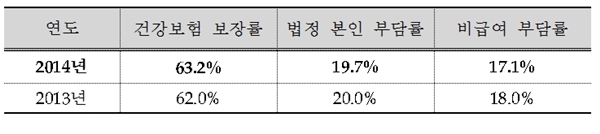 연구결과에 따르면 최근 지속적으로 하락해왔던 건강보험 보장률은 2014년 63.2%로 전년대비 1.2%p 상승했다.