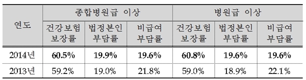특히 2014년 4대 중증질환 보장률은 77.7%로, 전년(77.5%)대비 0.2%p 상승했고, 비급여 부담률을 14.7%로 같은 기간(15.3%) 대비 0.6%p 줄어들었다.