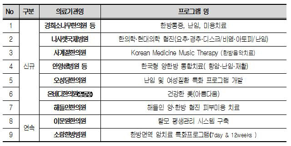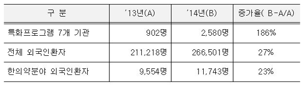 한의약 특화프로그램은 해외환자유치 활성화를 목표로 지난 2014년 처음 시작됐는데, 그 효과가 크다는 것이 정부의 설명이다. 복지부는 2014년 선정된 7개 기관의 해외환자유치 실적이 전년 대비 약 3배(186%) 증가한 것으로 나타났다고 밝혔다.