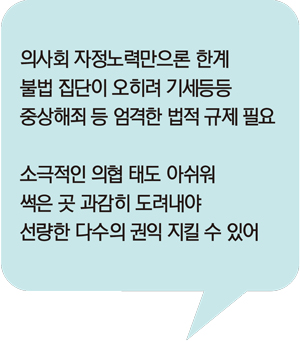 오히려 잘못된 부분에 대해 명확한 판단과 함께 확실한 선을 그어줘야 다수의 선량한 의사들의 권익이 지켜지는 것임을 알아야 한다.