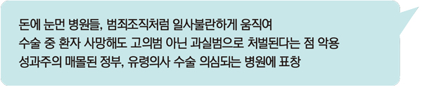 창고식 유령수술이라고 아는가? 커다랑 방에 침대를 10여개를 가져다 놓고, 커튼으로 가린다. 그리고 환자들을 마취시킨 의사는 나가버리고 유령의사가 들어와서 환자 몸에 칼을 대는 게 창고식 유령수술이다. 이런 짓을 하면 병원에 어마어마한 이익이 남는다.