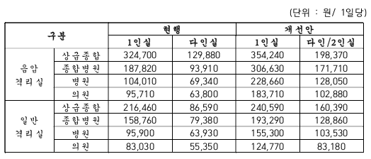 격리실 입원료는 입원 1일당 음압 1인실 35만원, 일반 1인 격리실은 24만원으로 정해졌다. 그간 중환자실 내에서는 환자를 격리해 진료해도 별도 수가가 없었으나, 이에 대해서도 수가를 신설해 음압병상은 11만원, 일반병상은 3만원을 추가로 지급키로 했다.