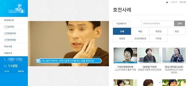 J씨의 치료경험담에는 해당 한방병원의 로고가 그대로 게재돼 있고, 인터뷰 중간중간 담당 한의사가 동석해 “빠르게 기력을 회복해가는 모습을 보면 큰 희망을 갖게 된다”며 J씨의 주장을 뒷받침하는 말을 하기도 한다.