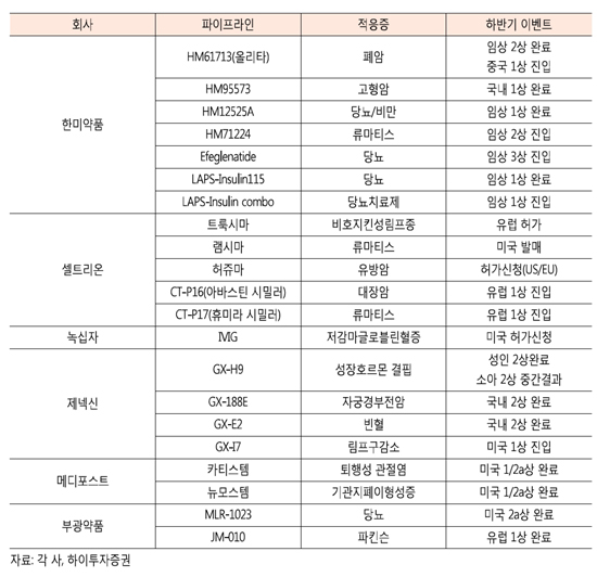 아울러 하반기에도 임상종료, 품목 허가 등 확실한 R&D 모멘텀을 기대하게 하는 회사들이 줄줄이다.
