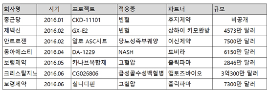 하이투자증권에서 집계한 올해 상반기 제약바아오 업체 기술계약 사례를 보면 올 1월 종근당이 후지제약과 CKD-11101에 대한 수출계약을 체결하는 것을 시작으로 총 7건의 기술수출이 있었다. 금액은 6800억원 규모에 이른다.(종근당 비공개 금액 제외)