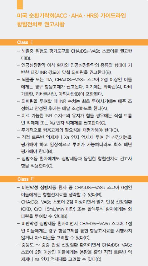 이번 지침에서는 약물의 사용 대상도 구체적으로 명시했다. CHA2DS2-VASc 스코어가 1점 이상인 경우 항응고요법을 시행해야 하는데, 우선 와파린 대상군은 두 가지로 구분했다. 첫 번째는 판막치환술을 시행한 경우 또는 류마티스성 판막질환이 있는 경우, 두 번째는 비판막성 심방세동 환자 중 출혈성 합병증이 없고 INR이 잘 조절되는 경우다. 요약하면 와파린의 강력한 항응고 효과가 필요한 판막환자나 와파린으로도 문제 없이 조절이 가능한 환자가 해당된다.