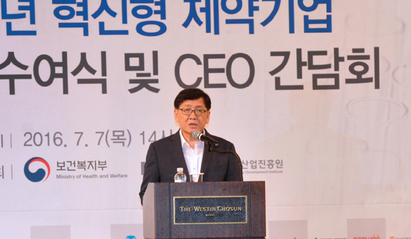 7일 서울 중구 웨스틴조선호텔에서 개최된 '2016 혁신형 제약기업 CEO간담회'에서는 2016년 혁신형 제약기업으로 신규인정된 6개사를 축하하고 국내 제약산업 발전을 위한 약가정책 개선안을 설명하는 자리가 마련됐다.