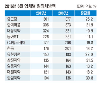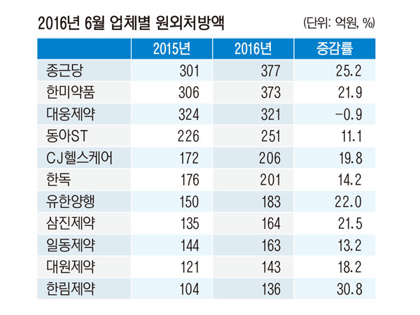 이어 동아에스티와 CJ헬스케어가 각각 251억원 206억원의 처방액을 기록하며 4위, 5위에 올랐다. 이어 한독 원외처방액이 201억원으로 6개 제약사가 200억 이상 원외처방액을 기록했다.