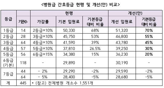 구체적으로는 기본등급 수가를 1% 인상하는 한편, 가산 시작 구간인 5등급 이상 가산률을 현행 15~68%에서 20~70%로 높이기로 했다.