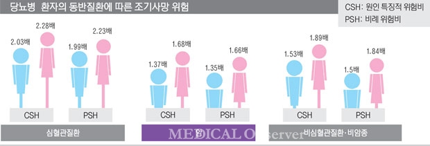 위험도를 세부적으로 평가하기 위해 원인 특징적 위험비(CSH)와 비례위험비(PSH)를 각각 적용해 당뇨병 환자에서 심혈관질환, 암 등의 동반질환 유무에 따른 조기 사망 위험을 분석했다.