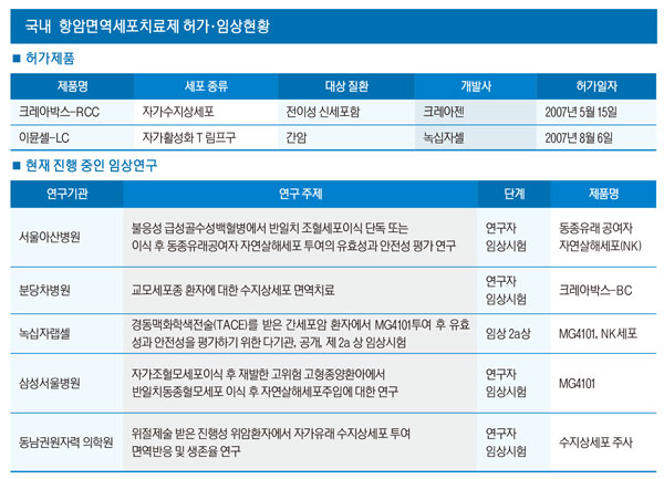 반면 우리나라는 항암면역세포치료제 초기 단계의 연구 개발을 지나 대규모 투자가 요구되는 임상단계에서 첨단기술이 갖는 불확실성으로 인해 다양한 디자인으로 큰 규모의 임상연구가 필요하지만, 이를 감당할 수 있는 규모의 기업 또는 국가적 지원이 매우 제한적이라는 게 전문가들의 전언이다.