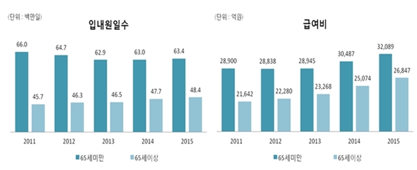 이 중 65세 이상 1인당 연평균 입내원일수는 101.2일로, 65세 미만(63.8일)에 비해 1.59배였고, 1인당 연평균 급여비는 65세 이상이 561만 8000원으로, 65세 미만의 1.74배(322만 3000원)에 달했다.