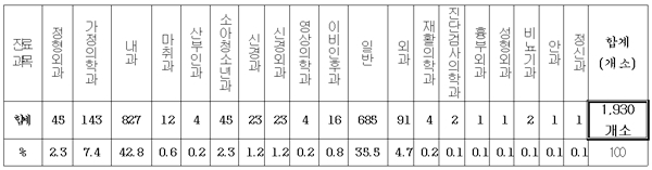 일반과는 35.5%(685곳)로 내과 뒤를 이었고, 가정의학과 7.4%(143곳), 외과 4.7%(91곳) 순이었다.