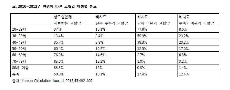 한편 한국인구의 고령화에 따라 노인 고혈압이 크게 증가한 것으로 나타났다. 2010과 2012년 사이 고립성 이완기 고혈압은 감소한 반면, 고립성 수축기 고혈압은 연령대가 높을수록(≥40세) 증가한 것으로 확인됐다.