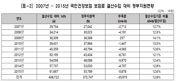 실제로 건강보험에 대한 정부지원액을 결산수입을 기준으로 분석한 결과, 14%를 지원해야 하는 일반회계에서만 2007년부터 2015년까지 3조 5975억원이 적게 지원된 것으로 나타났다.